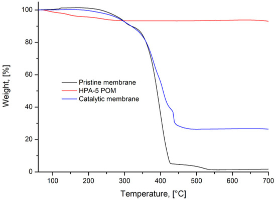 TGA profiles of the pristine PS-b-PDMAEMA membrane (black curve), HPA-5 POM catalyst (red curve) and PS-b-PDMAEMA membrane functionalized with HPA-5 POM catalyst (blue curve).