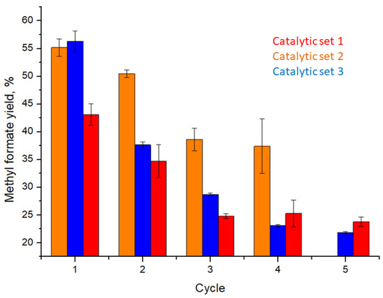 Catalytic activity of HPA-5 POM functionalized block copolymer membranes toward glucose to formic acid methyl ester oxidation in three catalytic sets calculated via head-space GC–MS. The confidence interval was calculated at 95% confidence level.