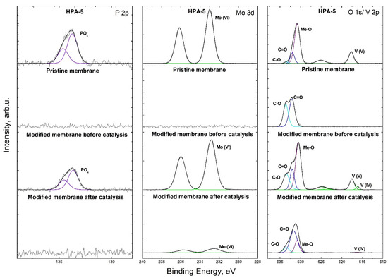 In addition, the changes in the content of P, Mo and V in the pristine membrane and in the modified membrane before and after the catalytic process were analyzed via XPS (Figure 9). For comparison, the data from H8[PV5Mo7O40] XPS were also added. The signals in the XP spectrum of the H8[PV5Mo7O40] catalyst are a P 2p doublet (P-O) at 133.7/134.6 eV (energy separation 0.87 eV) assigned to P(V), a Mo 3d doublet (Mo-O) at 233.0/236.1eV (energy separation 3.15 eV) corresponding to Mo(VI) and a V 2p doublet (V-O) at 517.7/525.1 eV (energy separation 7.40 eV) corresponding to V(V). The successful electrostatic attachment of the heteropolyoxometalate anion was confirmed by the presence of its signal patterns in the spectrum of the modified membrane before catalysis. The content of P, Mo and V in the modified membrane was 0.6, 4.0 and 1.6 at%, respectively. It was also noticed that the V 2p doublet at 516.1/523.5 eV, belonging to the V(IV) ion, appeared after the catalyst immobilization on the membrane, with a quantitative ratio of V(V) to V(IV) of 4:1. In the XP spectrum of the membrane after five catalytic cycles, the P(V) 2p doublet completely disappeared; the Mo(VI) 3d doublet signal decreased, as the signal dropped from 4.0 to 0.5 at%; and for vanadium, the peak V(V) 2p was absent, and only a weak signal corresponding to V(IV) was recorded, with intensity drop from 1.6 to 0.1 at%. The presence of the V(IV) signal confirms the assumption of incomplete oxidation of the catalyst at 2.4 bar partial oxygen pressure. From our point of view, the analysis of the changes in the content of Mo, V and P in a catalytic membrane after catalytic reactions via XP spectroscopy is merely qualitative because of the small analysis depth of this technique (≈5–10 nm) in comparison to the thickness of the membrane (tens of µm). As a result of this, in the case of our material, we mostly rely on bulk analysis of the reaction solutions via the ICP-OES analysis technique for the quantification of catalyst leaching.