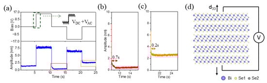 Piezoelectricity, the linear coupling of mechanical deformation and electric fields first discovered in 1957 [1,2], has become significantly important in the growing demand for high-performance and miniaturized devices such as nanoelectromechanical systems (NEMS) [3,4,5] and electronics. Two-dimensional (2D) materials with noncentrosymmetry, particularly transition-metal dichalcogenides (TMDCs), have emerged as ideal candidates for low-dimensional piezoelectric materials [6]. Piezoelectricity in two-dimensional materials has led to investigations into novel low-dimensional systems like nanotubes and single molecules [7,8]. For example, free-standing monolayer MoS2 membranes exhibit molecular piezoelectricity only in odd-layer configurations where inversion symmetry breaking occurs [9]: WSe2 possesses noncentrosymmetry and potential for linear piezoelectricity [10]. However, the limitation of symmetry in bulk materials often prevents their piezoelectric behavior, whereas atomic-level thin-layer structures can break symmetry and exhibit anomalous piezoelectricity [11]. First-principle calculations have shown that the 2D Janus Te2Se monolayer and its multilayers exhibit a large in-plane and out-of-plane piezoelectric response due to structural symmetry breaking and flexible mechanical properties [11]. Moreover, density functional theory (DFT) calculations have predicted the potential for a ferroelectric state and piezoelectric response in bulk Bi2O2Se under an in-plane biaxial strain, which has been experimentally supported by ultrathin free-standing nanosheets of Bi2O2Se breaking local inversion symmetry [12]. While the research on these new materials has expanded the range of piezoelectric materials, little attention has been given to exploring the piezoelectricity of thinner layers of Bi2Se3, a topological insulator (TI) known for its topological surface states and large bandgap (0.3 eV) in bulk [13,14]. Thus, the aim of this work is to investigate and provide evidence for the piezoelectric properties of Bi2Se3 nanosheets.