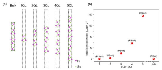 (a) The optimized structure of Bi2Se3 bulk and layers from 1 QL to 5 QL and the (b) corresponding piezoelectric coefficient d33. The space group of these structures is marked as well.