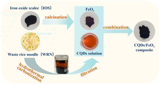 In this study, we successfully synthesized low-cost CQDs/FeOx composites by combining waste rice noodle (WRN) and iron oxide scale (IOS) and assessed their photocatalytic performance. The key steps in our synthesis strategy were identified: first, calcining IOS in an air atmosphere to enhance the photocatalytically active α-Fe2O3 content; second, incorporating WRN-based CQDs into FeOx to enhance the electron-hole pair separation, leading to increased O2 reduction and H2O oxidation. This significantly improved the photocatalytic performance. The resulting CQDs/FeOx composites efficiently degraded various organic pollutants under purple light irradiation and had superior magnetic properties, allowing for easy separation and reuse.