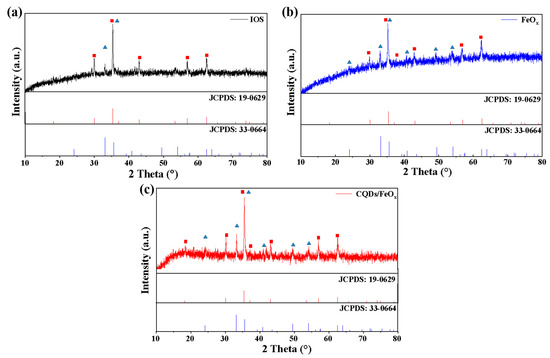 PXRD pattern of IOS (a), FeOx (b) and CQDs/FeOx composite (c). The red square and blue triangle represent the diffraction peaks of Fe3O4 and α-Fe2O3, respectively.