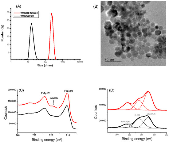 Characterizations of IONP (black) and IONP@CA (red). (A) DLS measurement. (B) TEM images: XPS spectra of IONP and IONP@CA. (C) HR-Fe 2p region. (D) HR-C 1s region.