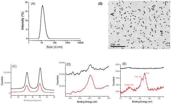 The same investigations were performed on AuNPs@CA and AuNPs@ATH [37]. DLS and TEM measurements confirmed that we succeeded to synthesize, by the Turkevich route, spherical particles of about 10 nm in size (Figure 2A,B). These particles are mainly metallic gold particles covered by citrate species, as confirmed by XPS (Figure 2C–E), which can be easily replaced by AHT, as the affinity of gold to thiols is higher than that of carboxylates. Typically, for both kinds of particles, the XPS Au 4f signal is consistent with a 4f5/2 and 4f7/2 doublet of Au0 at 87.7 and 84.0 eV, respectively [47]. XPS N 1s spectra showed an increased signal for the particles grafted to AHT: a broadened peak at 400 eV, characteristic of amino/ammonium groups, was evidenced [48]. Similarly, only the S 2p XPS spectrum of coated particles exhibits a typical signature of sulfur on the AuNPs@ATH surface [49,50]. The peaks at 161.9/163.1 eV, 164.0/165.2 eV, and 167.9/169.1 eV can be easily assigned to the S 2p3/2 and S 2p1/2 signals of thiol in interaction with gold (grafted), free thiol, and oxidized thiol, respectively, with the major one being the first.