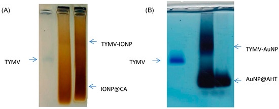After activating the –COOH of TYMV, AuNPs@AHT-bearing amino groups were attached by EDC/NHS coupling, and, reversely, the carboxylate groups of IONP@CA were activated to react with the amino groups of TYMV. Indeed, each subunit of TYMV capsid contains 4 acidic amino acids (Glu or Asp) and two lysines accessible at the exterior surface [51], enabling the attachment of inorganic particles by one route or another. In both cases, after grafting, the unreacted IONPs@CA, AuNPs@AHT, and TYMV were separated from IONPs and AuNPs covalently bound to TYMV (TYMV-IONP and TYMV-AuNP) using agarose electrophoresis (Figure 3A,B, respectively). The gel was stained with Coomassie blue to detect the TYMV capsid. For both systems, the iron oxide or gold grafted onto TYMV migrated slower than free TYMV and single nanoparticles. In this way, the bands corresponding to the produced nano-biohybrid were digested by agarose, as previously described [37].