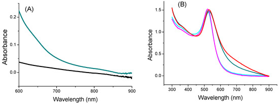 UV-Visible-NIR absorption spectra of (A) IONP (black) and TYMV-IONP (dark cyan) and of (B) AuNP (cyan) and TYMV-AuNP (dark cyan). For comparison, the spectra of 20 nm-sized AuNP@AHT colloids (magenta) and their related nano-biohybrids (red) are also given.