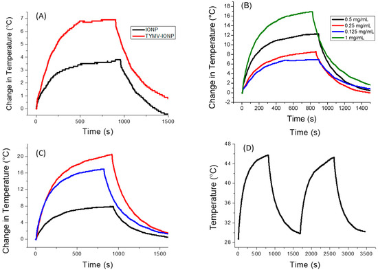For the iron oxide-based colloids, an increase in absorption was observed for the particle assembly (Figure 5A). Consequently, an improved photothermal effect was expected on the clustered particles, as already reported [53]. In the present case, after only 5 min of irradiation at 808 nm (0.41 W/cm2), the temperature of the solution containing free IONPs (0.125 mg/mL of Fe) increased by 3 °C, with the equilibrium temperature of 3.5 °C reached after 10 min of irradiation. The higher the iron concentration, the higher the temperature [54]; the temperature reached more than 15 °C for a concentration for 1 mg/mL (Figure S2). When IONPs were assembled around the virus capsid, the change in temperature increased to 5.6 °C (0.125 mg/mL of Fe), with the equilibrium temperature of 6.9 being reached after 10 min of irradiation (Figure 6A). When the laser is off, the temperature decreases and returns to its initial value. Similar to free IONPs, as the iron concentration increases from 0.125 mg/mL to 1.00 mg/mL, TYMV-IONP samples exhibit a more important temperature increase: from 5.6 to 13.8 °C after 5 min, reaching the equilibrium after more than 10 min at slightly higher temperature values (Figure 6B). Finally, the temperature changes vary with the laser power density (Figure 6C, Table 1). Because living cells are able to self-repair the damages induced by heat, the laser irradiation was repeated several times [55]. In practice, the studied colloids were irradiated at 808 nm during 5 min (laser on). When the temperature decreased to room temperature after the laser was turned off, a new irradiation cycle was applied, and this process was repeated for a total of two “on-off” cycles, measuring, at each cycle, the photothermal response (Figure 6D). The recorded data clearly confirmed that TYMV capsid can resist a temperature rise of at least 16.9 °C.