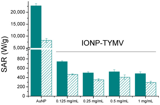 Comparing now TYMV-IONP and TYMV-AuNP biohybrids, the assembly of AuNPs of similar size exhibited a 30-fold higher SAR value (Figure 8) and reached the equilibrium temperature more rapidly (5 vs. 10 min). Our results are consistent with those of several other groups, which have demonstrated that gold presents better photothermal properties than iron oxide nanoparticles, and that, at low concentrations of metal, plasmonic nanoparticles can deliver more efficient therapeutic heating [56,58]. This is particularly true when the light absorption capability of gold particles is adjusted around the operating photothermal light excitation wavelength. The light absorption properties of iron oxide particles offer less tunability.