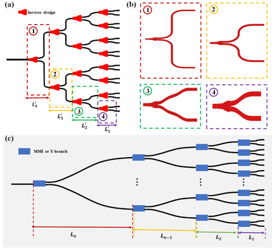 For the entire beam-splitting structure, we employed four inverse-designed beam splitters. For the third and fourth layers with a larger vertical spacing, we utilized inverse-designed T-branch waveguides. For the first and second layers with smaller vertical spacings, we employed inverse-designed Y-branch waveguides, as illustrated in Figure 1b. Figure 1c shows a conventional OPA beam-splitting structure composed of cascaded MMIs or Y-branches. The lateral spacing Ln between the splitters can be expressed as follows: