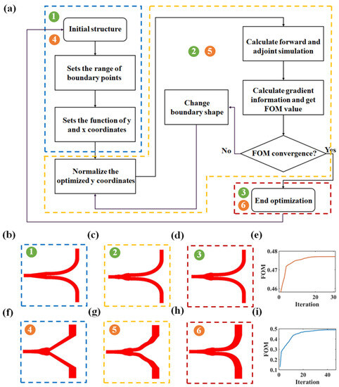 The four optical power splitters shown in Figure 1b were obtained using a staged shape-adjoint optimization design. As a form of the adjoint method in inverse design, shape-adjoint optimization establishes a mapping relationship between the coordinates of the boundary points (x and y). We use the python API in Lumerical FDTD 2020 (which is described in detail on the official website and is open source) to pass custom shape functions, material properties, optimized geometric ranges and constraints, and then perform iterative optimization according to the algorithm flow diagram shown in Figure 2a.