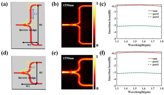 In addition, we compared the T-branch of the one-stage inverse design with that of the two-stage inverse design, as shown in Figure 5. The structures within the yellow dashed boxes were all obtained through inverse design. It can be observed that the boundaries of these optimized structures vary, which is a characteristic of shape-adjoint optimization in inverse design. Figure 5a illustrates the T-branch subjected to a one-stage inverse design, where we employed low-loss Euler waveguides as the bent waveguides of the T-branch and optimized the shape of its coupling region through an inverse design. However, because of the fixed bending radius of Euler waveguides at a certain curvature radius, they may not be suitable for T-branches with arbitrary stretching lengths, which can lead to light leakage, as shown in Figure 5b. Figure 5c shows the T-branch obtained using the two-stage inverse design, and Figure 5d shows the optical field distribution at a wavelength of 1550 nm. The T-branch obtained through the two-stage inverse design not only has a lower insertion loss at the bent waveguide but also reduces the lateral dimensions by 2.82 μm. Figure 5e compares the variation range of the insertion loss for the two types of T-branch structures in the wavelength range of 1300–1800 nm. The T-branch obtained through the two-stage inverse design exhibited significantly better performance than the T-branch obtained through the one-stage inverse design, particularly in the wavelength range of 1500–1800 nm.