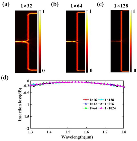 To validate the scalability and suitability of our proposed T-branch for large-scale OPA, we simulated five different heights of T-branches, representing the outermost T-branches in the 1 × 32, 1 × 64, 1 × 128, 1 × 256, and 1 × 1024 OPAs. Their heights H are 40.5 μm, 80.5 μm, 160.5 μm, 320.5 μm, and 1280.5 μm, respectively. Figure 4a–c depict the optical field distributions of the outermost T-branches of the OPA at 1550 nm on a certain scale. Additionally, we compared the insertion loss of the five different-height T-branches with the outermost T-branch of the 1 × 16 OPA, as shown in Figure 4d. For the proposed two-stage inverse-designed T-branch, when the OPA scale changes, only the length of the straight waveguide in the T-branch must be adjusted. Therefore, when the OPA scale does not exceed 1 × 256, the range of variation in the insertion loss in the T-branch within the wavelength range of 1300–1800 nm is within −0.2 dB. Even when the OPA scale reaches 1 × 1024, the insertion loss in the T-branch still remains within a variation range of −0.2 dB.