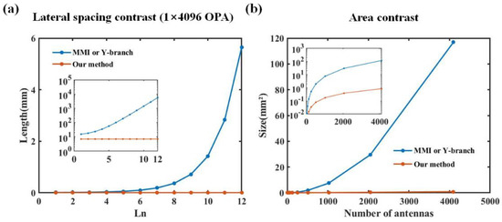 To highlight the advantages of our ultra-compact OPA design, we compared it with a traditional cascaded structure using MMI or Y-branch components, as shown in Figure 9. According to Equation (2), as the scale of the OPA array increases, the lateral size based on the MMI or Y-branch scheme exhibits an accumulative trend. When Ln reaches 12 (corresponding OPA scale is 1 × 4096), the length of L12 alone exceeds 5.5 mm. In contrast, when using our inverse-designed T-branch scheme, regardless of the array size, the lateral spacing Ln between adjacent splitters remains 7 μm, as shown in Figure 9a. The inset shows the result of using a logarithmic scale for the y-axis. Under the same OPA height conditions, we also compared the areas obtained using different splitting schemes, as shown in Figure 9b. When the OPA reaches a scale of 1 × 4096, the area of the traditional OPA approaches 120 mm2, making it difficult to integrate it onto a chip. However, the OPA based on our scheme has an area of less than 1 mm2 on the same scale. Compared with the traditional solution, we reduced the area by a factor of 120.