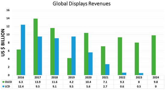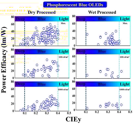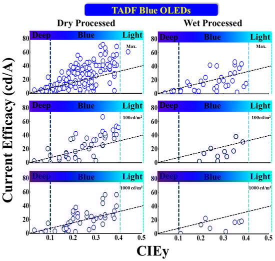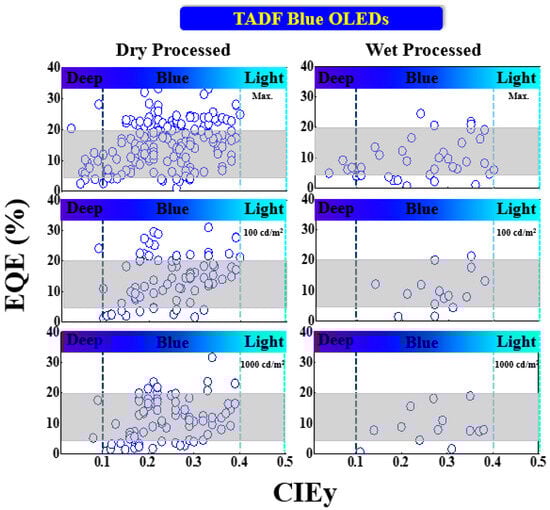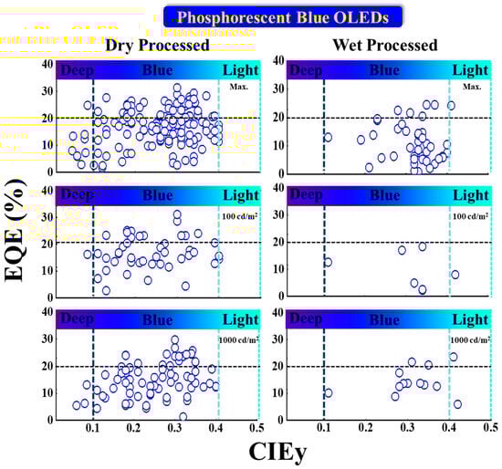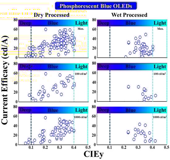 - Jeon, S.O.; Lee, K.H.; Kim, J.S.; Ihn, S.G.; Chung, Y.S.; Kim, J.W.; Lee, H.; Kim, S.; Choi, H.; Lee, J.Y. High-Efficiency, Long-Lifetime Deep-Blue Organic Light-Emitting Diodes. Nat. Photonics 2021, 15, 208–215. [Google Scholar] [CrossRef]
