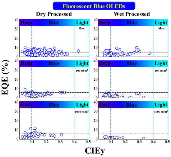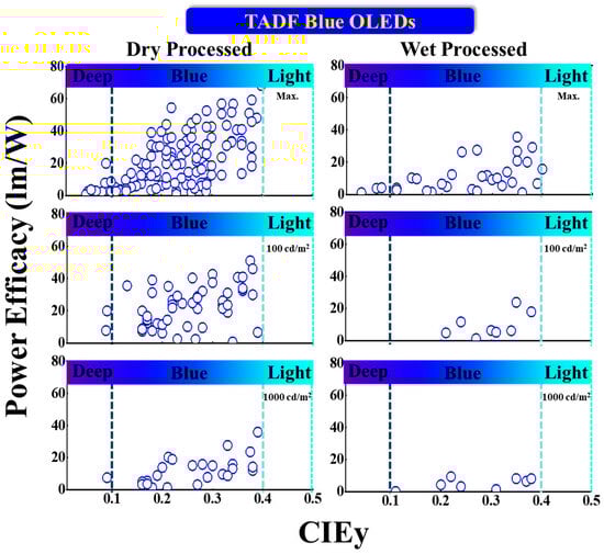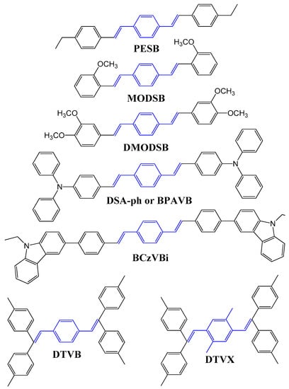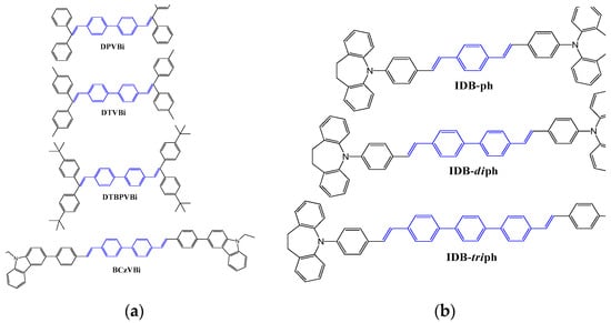 - Peng, L.; Yao, J.W.; Wang, M.; Wang, L.Y.; Huang, X.L.; Wei, X.F.; Ma, D.G.; Cao, Y.; Zhu, X.H. Efficient Soluble Deep Blue Electroluminescent Dianthracenylphenylene Emitters with CIE y (Y ≤ 0.08) Based on Triplet-Triplet Annihilation. Sci. Bull. 2019, 64, 774–781. [Google Scholar] [CrossRef] [PubMed]
