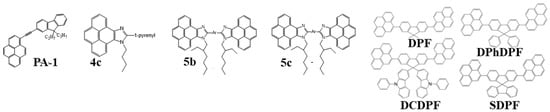 - Fu, C.; Luo, S.; Li, Z.; Ai, X.; Pang, Z.; Li, C.; Chen, K.; Zhou, L.; Li, F.; Huang, Y.; et al. Highly Efficient Deep-Blue OLEDs Based on Hybridized Local and Charge-Transfer Emitters Bearing Pyrene as the Structural Unit. Chem. Commun. 2019, 55, 6317–6320. [Google Scholar] [CrossRef]