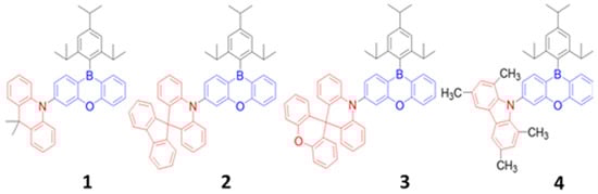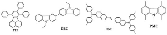 - Lin, S.L.; Chan, L.H.; Lee, R.H.; Yen, M.Y.; Kuo, W.J.; Chen, C.T.; Jeng, R.J. Highly Efficient Carbazole-π-Dimesitylborane Bipolar Fluorophores for Nondoped Blue Organic Light-Emitting Diodes. Adv. Mater. 2008, 20, 3947–3952. [Google Scholar] [CrossRef]