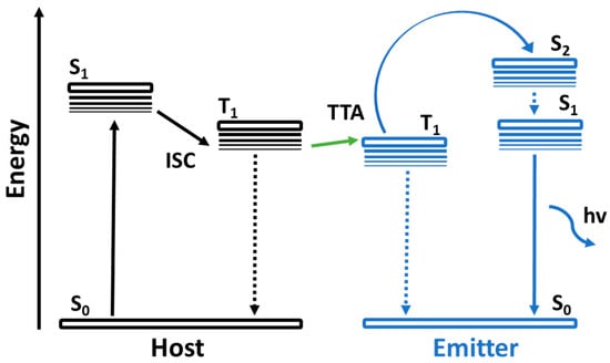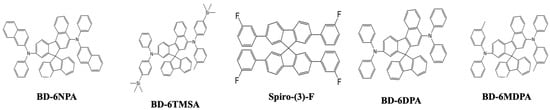 - Chen, Y.H.; Lin, C.C.; Huang, M.J.; Hung, K.; Wu, Y.C.; Lin, W.C.; Chen-Cheng, R.W.; Lin, H.W.; Cheng, C.H. Superior Upconversion Fluorescence Dopants for Highly Efficient Deep-Blue Electroluminescent Devices. Chem. Sci. 2016, 7, 4044–4051. [Google Scholar] [CrossRef]