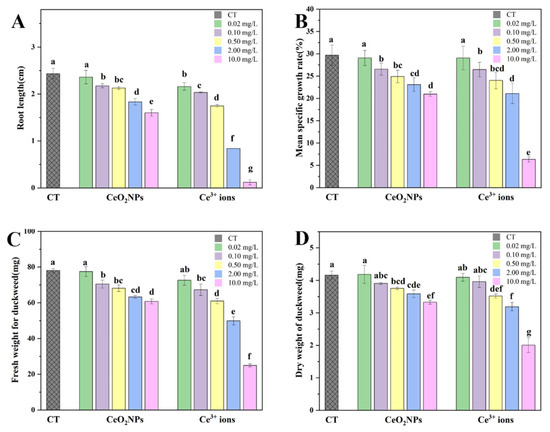 Root length (A), mean specific growth rate (B), fresh weight (C), and dry weight (D) of the duckweed treated with CeO2 NPs and Ce3+ ions. Different letters indicate significant differences (p < 0.05).
