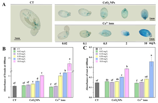 The cell membranes of plants are selective, and the dye can be excreted by living cells when plant tissues are immersed in the Eb dye. Therefore, Eb staining can show cell death and assess the degree of cell membrane damage. As shown in Figure 2A, with the increase of concentrations of CeO2 NPs and Ce3+ ions, the fronds of duckweed were gradually stained with Eb, indicating that the cell activity decreased and oxidative stress increased. The quantitative results showed that the amount of Eb in the ionic group was about twice that in the NPs group at the highest concentration (Figure 2B), suggesting that the former caused more severe oxidative damage to duckweed. The staining of duckweed roots also showed concentration dependence, but there was no significant difference between the two treatments when the concentrations was lower than 0.5 mg/L (Figure 2C). At 10 mg/L Ce3+ ions, the root elongation was too short to be collected and measured.