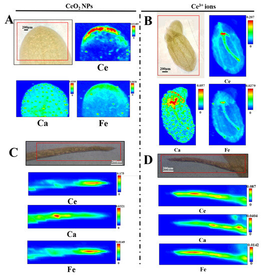μ-XRF images of Ce, Ca, and Fe in the fronds (A,B) and roots (C,D) of duckweed exposed to 10 mg/L CeO2 NPs (A,C) and Ce3+ ions (B,D). The red color in each image corresponds to the maximum concentration of the element.
