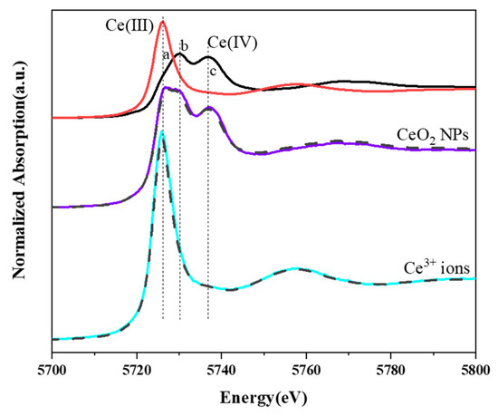 The speciation of Ce in the duckweed treated with 10 mg/L CeO2 NPs and Ce3+ ions was analyzed using XANES. In Figure 5, line a represents the characteristic peak of Ce(III), and lines b and c represent the characteristic peaks of Ce(IV). The spectrum of Ce in the sample of the NP group seemed to be a mixture of Ce(III) and Ce(IV) standard reference spectra. In contrast, the peak of Ce in the ionic group sample completely coincided with line a, suggesting that only Ce(III) existed. LCF results revealed that about 27.6% of Ce(IV) was reduced to Ce(III) in the NPs group, whereas 100% of Ce was present as Ce(III) in the ions group.