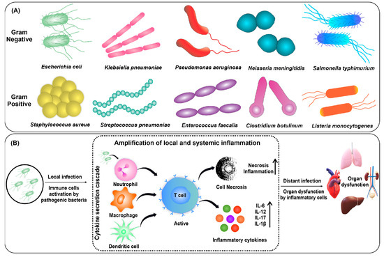 (A) The representative Gram-positive and Gram-negative bacteria causing sepsis; (B) the mechanism of sepsis. Reproduced with permission from [20]. Copyright 2018, Wiley.
