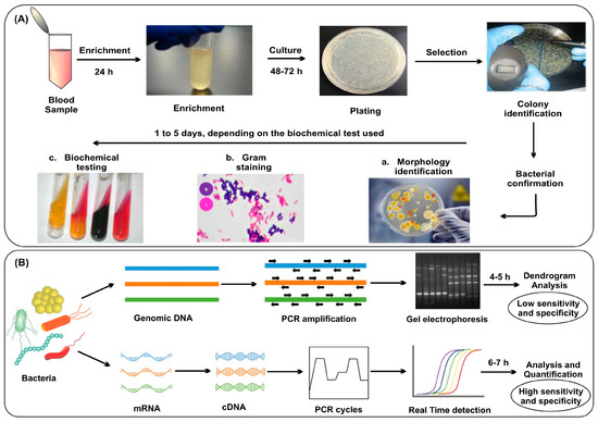 Methods for bacterial identification with (A) culture-based method, (B) PCR-based method. Reproduced with permission from [47,54]. Copyright 2020, Wiley; copyright 2020, Springer.