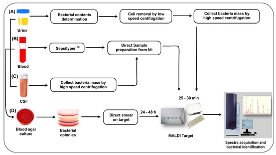 Workflow of MALDI-TOF-MS for bacterial identification. Some liquid samples such as (A) urine, (B) positive blood culture bottles, and (C) cerebrospinal fluid can be applied for direct identification following some sample preparation and extraction protocol, and (D) bacterial culture from standard agar plate. Reproduced with permission from [67]. Copyright 2020, Elsevier.