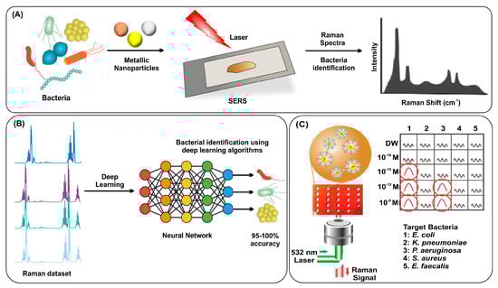 (A) Workflow for bacterial identification using SERS, (B) workflow for accurate bacterial identification using deep-learning strategy, and (C) measurement of Raman signals from the solutions in a multi-well array showing specificity for target bacteria. Reproduced with permission from [97,104,110]. Copyright 2022, American Chemical Society; copyright 2020, Wiley; copyright 2021, Elsevier.