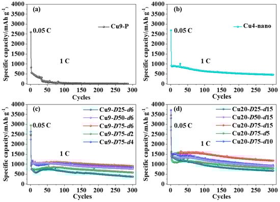 Cycling performance of the Si anodes: (a) Cu9-P, (b) Cu4-nano, (c) Cu9-D75-d6, and (d) Cu20-D75-d15.