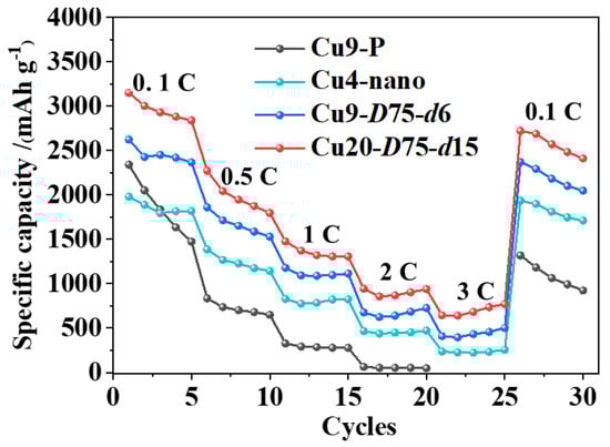Furthermore, rate performance is compared to highlight the structural benefits of laser-textured current collectors. Four different current collectors, namely, the smooth Cu9-P, nanostructured Cu4-nano, and hierarchical micro/nanostructured Cu9-D75-d6 and Cu20-D75-d15, are selected for the evaluation, and the results are shown in Figure 4. The rate performance of Si anodes exhibits evident improvement when using the nanostructured Cu4-nano compared to the smooth Cu9-P. Furthermore, this improvement is further enhanced by the hierarchical micro/nanostructure and increases with higher groove density and depth. Among the evaluated anodes, the Cu20-D75-d15 configuration with the largest groove density and depth shows the highest capacity of 684 mAh/g at 3 C.