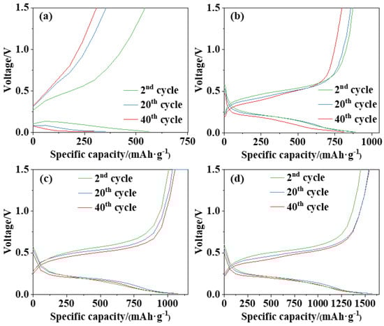 Voltage–capacity curves of the Si anodes: (a) Cu9-P, (b) Cu4-nano, (c) Cu9-D75-d6, and (d) Cu20-D75-d15.