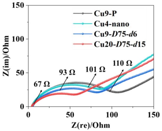 The electric contact is further validated through EIS measurement. In Figure 6, the Nyquist plots of the Si anodes with the four types of current collectors are shown at the delithiation state after the 50th cycle. The semicircle at high-medium frequency (103–105 Hz) mainly represents the charge transfer resistance (Rct). After laser texturing, there is a significant reduction in Rct, which continues to decrease as the groove density and depth increase. This reduction in Rct contributes to enhanced electric contact in the Si anode. The electric contact is primarily determined by the contact area between the anode coating and the current collector, as well as the structural stability [25]. These factors are crucial in determining cycling life, as validated and analyzed below.