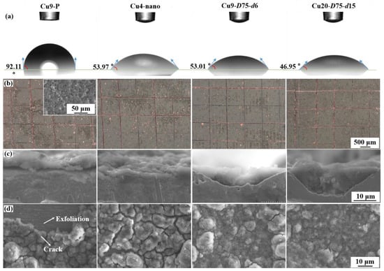 The slurry wettability is evaluated using contact angle measurement. As shown in Figure 7a, the contact angles for Cu9-P, Cu4-nano, Cu-D75-d6, and Cu-D75-d15 current collectors are 92.11°, 53.97°, 53.01°, and 46.95°, respectively. These results demonstrate that the Cu surface with nanostructures becomes more hydrophilic after laser texturing, and the hydrophilicity increases with an enlarged microgroove density and depth. The Cu-D75-d15 current collector, with the highest hydrophilicity, exhibits the most favorable slurry wettability, contributing to improved electric contact. Adhesive strength is further assessed using a scratch test. As shown in Figure 7b, the anode coating visibly peels off from the Cu9-P current collector, particularly near the scraped grid. The integrity of anode coating increases after laser texturing, improving further with increased groove density and depth. This demonstrates the improvement in adhesive strength achieved by the hierarchical nanostructures and microgrooves [17]. On the Cu20-D75-d15 current collector, the anode coating shows very little peeling.
