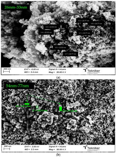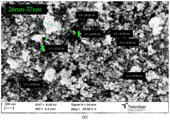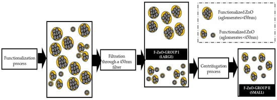 Figure 6c), the primary size hardly varied with respect to non-functionalized ZnO, showing a primary particle diameter between 23–37 nm and 54–77 nm, respectively. SEM images can visualize the NM agglomeration.