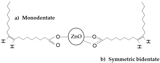 The effective surface functionalization of ZnO with oleic acid (OA) was evaluated by FTIR, TGA, and LECO. Different types of covalent anchorage such as monodentate binding mode or bidentate binding mode can be distinguished (