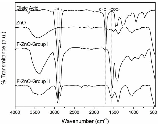 Figure 5 shows the FTIR spectra of oleic acid, ZnO, and the functionalized ZnO nanomaterials (F-ZnO-Group I, F-ZnO-Group II). The FTIR spectrum of oleic acid showed the asymmetric and symmetric stretching vibrations of -CH