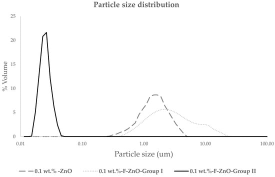 Figure 7) of the nanolubricants formulated at 0.1 wt.% of ZnO was measured to verify the cluster size promoted by each type of nanoparticle. Although the primary particle size of the different ZnO was similar, as it was identified by SEM, the proposed dispersion technique (surfactant, or surface functionalization) has conditioned the size of the obtained clusters, which was related not only to the stability of the systems but also to the promoted properties.