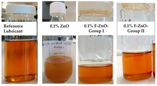 Figure 8). Nanolubricant stability was evaluated by a visual analysis of the samples. Sample aspect was evaluated after preparation as well as after 25 days of storage under static conditions at room temperature, and it was found that after 25 days those samples based on F-ZnO-Group I or by adding ZnO showed signs of instability, thus increasing sample turbidity, while systems formulated with the higher functionalization degree in the lower cluster size, F-ZnO-Group II, did not change the sample aspect, evidencing that for an effective dispersion, the lower cluster size combined with a high functionalization degree is more effective to keep electrostatic repulsion.