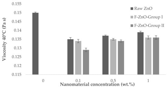 42]. A good dispersion of functionalized nanoparticles can lead to a decrease in lubricant viscosity due to the compatibility between the surface organic chains of the nanomaterials and the lubricant, results obtained for the F-ZnO Group II.