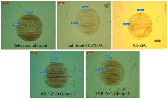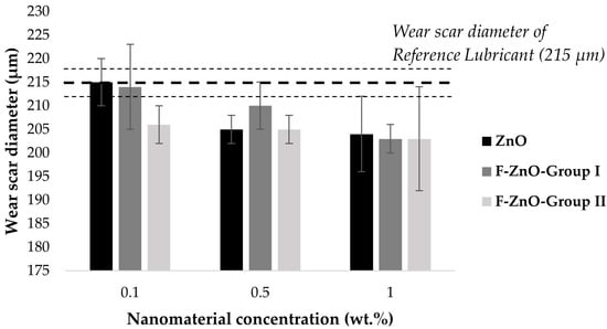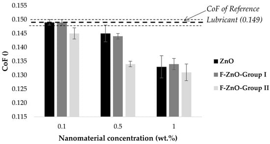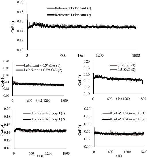 Figure 15) revealed a clear reduction in the mean CoF with the addition of F-ZnO-Group II nanomaterials. In particular, the higher the content of the nanomaterials was, the lower the CoF. Thus, the most noticeable result was obtained with a 2 wt.% concentration (CoF = 0.127), which provided a reduction of 15% of the CoF in comparison with the reference lubricant (mean CoF = 0.149). Again, a smooth, stable, and highly reproducible behavior of the coefficient of friction through time was observed for this nanolubricant. In addition, it must be mentioned that, even with a low concentration of nanomaterials, i.e., 0.5 wt.%, a significant reduction of 10% in wear scars was also achieved. On the other hand, with regards to wear protection, no clear correlation between particle content and ball wear diameter was observed.