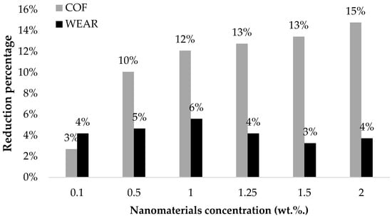 Figure 12), it was observed that, for these nanomaterials, the addition of 0.1 wt.% did not provide any CoF improvement. However, higher concentrations (0.5 wt.% and 1 wt.%) caused more significative CoF reductions in the range of 3–10% and 10–12%, respectively. In particular, it was observed that, in all the cases, having 1% of nanomaterials implied the most noticeable reduction in the CoF compared to the reference lubricant. This reduction was predictably caused by different mechanisms previously reported in the literature: (i) ZnO has been proven to show good friction and antiwear performance, promoting relative slippage of the nanomaterials in both counterparts [