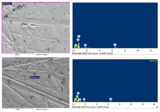 Table 9) confirmed the formation of a tribofilm, but, in this case, due to the base oil additives, which was confirmed by the detection of Zn, P, and S. These elements are directly related to the ZDDP and detergents commonly used in engine oils.