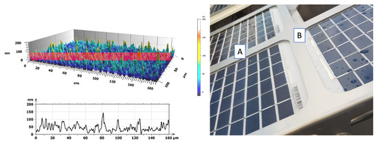 Figure 1. On the left, 3D image of sample and correlated roughness profile acquired by 3D interferometric and confocal profilometer of SH coating with Sa = 52 ± 4 nm, on the right a photo of coated (A) and uncoated (B) solar panel for field experiments.