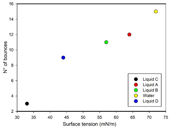 The way liquids interact with the SHS was observed and discussed analyzing high-speed videos able to capture the number of bounces for each liquid. In Figure 4 the number of bounces vs. the surface tension is reported.