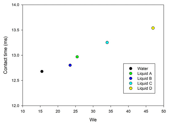 Drop contact time can be an additional parameter for following the evolution of drop dynamics and its dependence on We is reported in Figure 5. Considering that, all the liquids have similar densities and velocities, We underlines the role of surface tension in determining a linear behavior. Moreover, all the liquids result in a contact time range of 1 ms, indicating that even with a greater span of surface tension the superhydrophobic behavior is maintained.