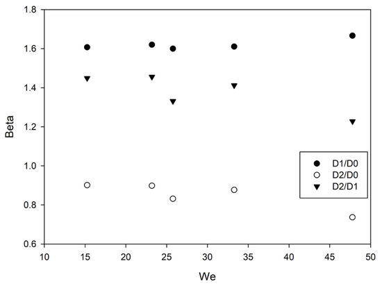 Figure 6. Spreading factor (β) vs. Weber number (We) of the used liquids in the first two impacts (D1/D0, D2/D0) and between the two impacts (D2/D1).