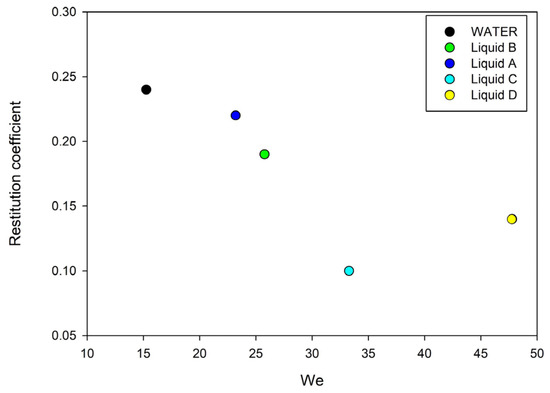 Contact angle analysis can provide further insight into the retraction regimes for the restitution coefficient. This parameter is defined as the ratio between the velocity after and before an impact and can represent a picture of the effect of potential drop impalement caused by viscous dissipation inside the coating roughness. Considering the liquid velocities as comparable, the Weber number strongly depends on surface tension and density as in Figure 7.